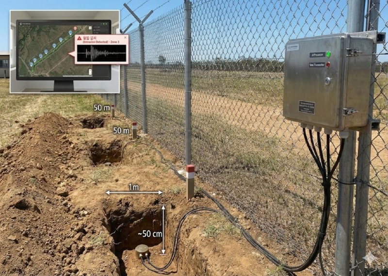 - 특징현재까지는 주로 Camera, Radar, 장력 센서 등을 이용한 지상 감지 솔루션은 보안 분야에 많이 적용됨. 땅속 감지 센서를 통한 지상 및 지하에 전방위적 경계 강화 가능